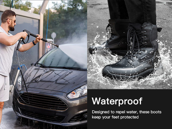 Crafted with waterproof black leather and a moisture-wicking lining, these boots keep your feet dry and comfortable in rain, mud, and wet conditions.